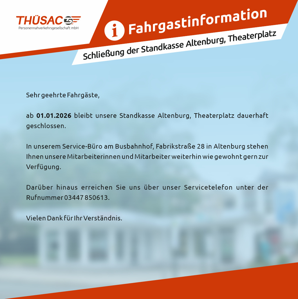 ab 01.01.2026 bleibt unsere Standkasse Altenburg, Theaterplatz dauerhaft geschlossen.