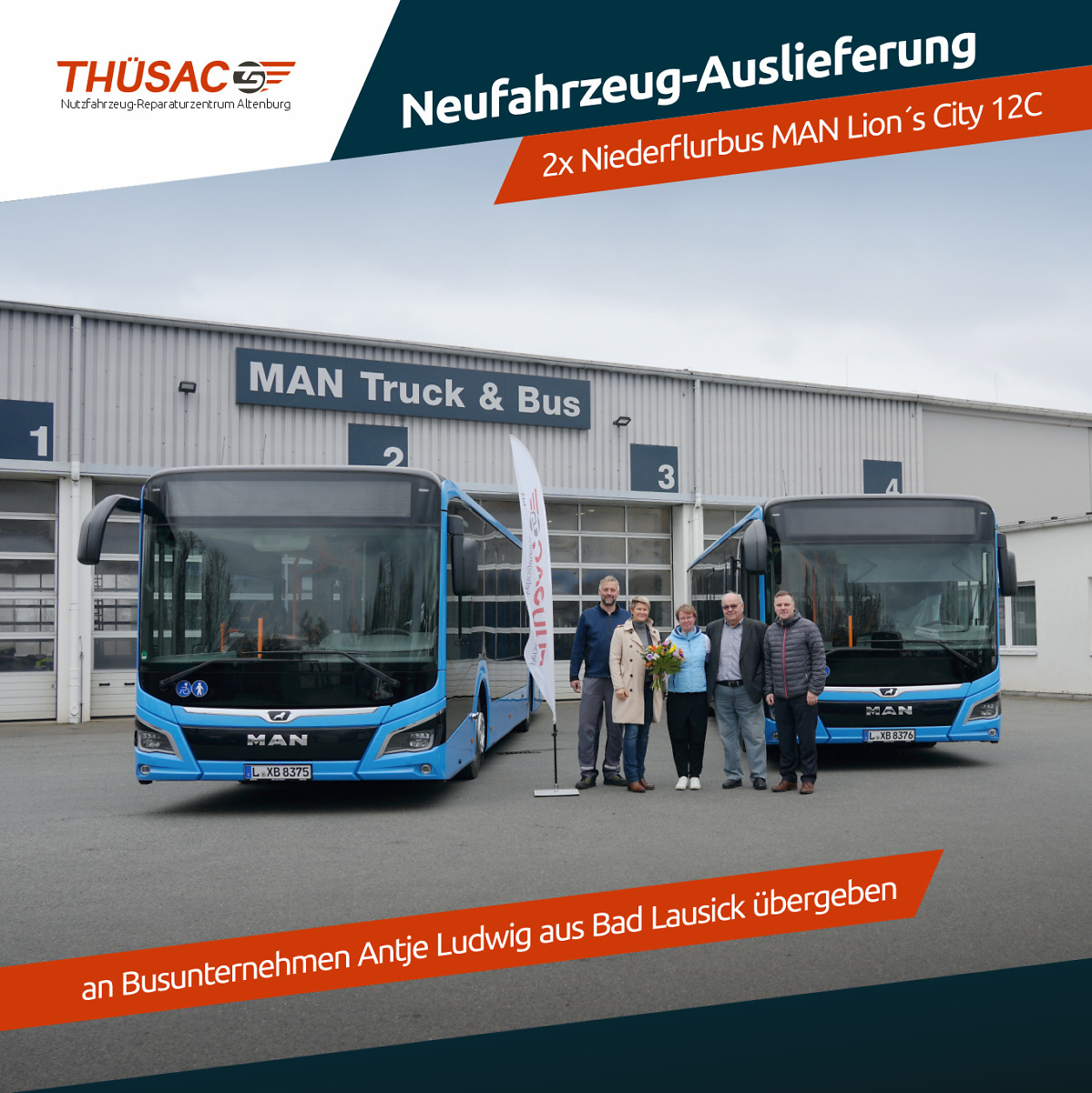 An unserem Standort in Windischleuba wurden kürzlich zwei neue Niederflurbusse vom Typ MAN Lion’s City 12 C gemeinsam mit dem MAN-Verkauf Leipzig an das Busunternehmen Antje Ludwig aus Bad Lausick übergeben.