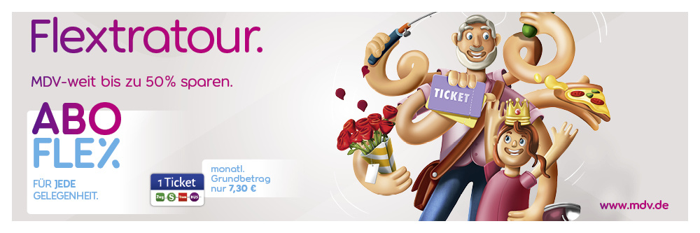 Jetzt neu für das gesamte MDV-Verbundgebiet: Mit dem ABO Flex erhalten Sie für einen monatlichen Grundbetrag von 7,30 Euro einen Rabatt auf die Einzelfahrkarte, Einzelfahrkarte Kurzstrecke und Extrakarte im Mitteldeutschen Verkehrsverbund (MDV). Der Rabatt kann dabei bis zu 50% des Ticketpreises betragen.